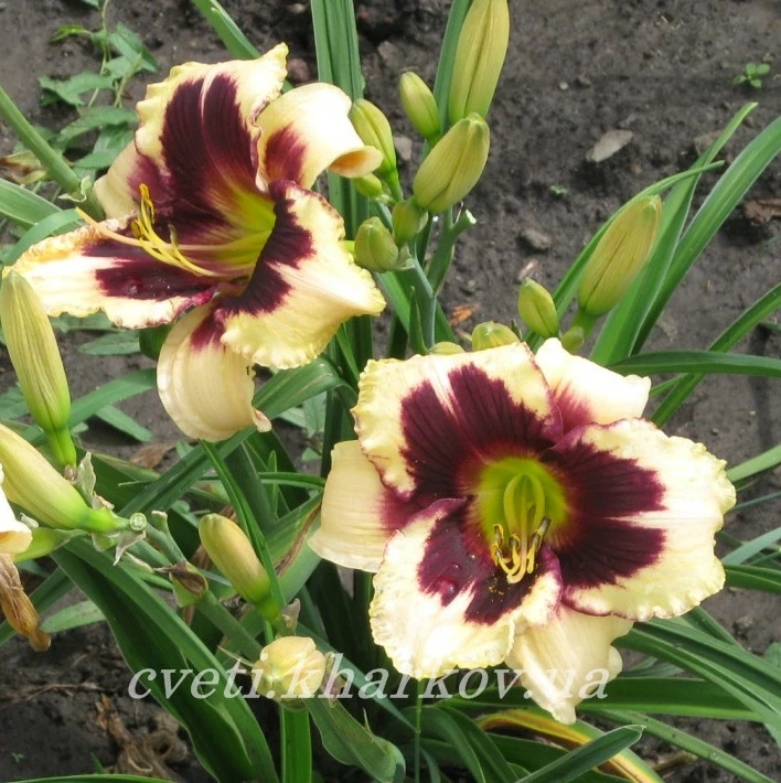 Кремово-жёлтый с огромным вишневым пятном, гофрированный, зеленое