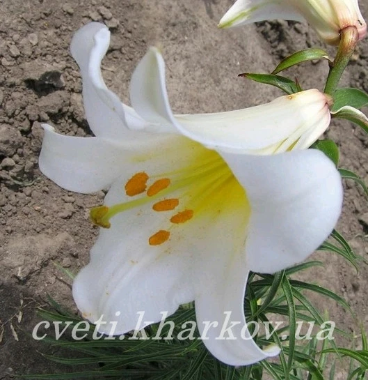 Трубчатая лилия белого цвета с желтым горлышком. Тычинки- желтые.